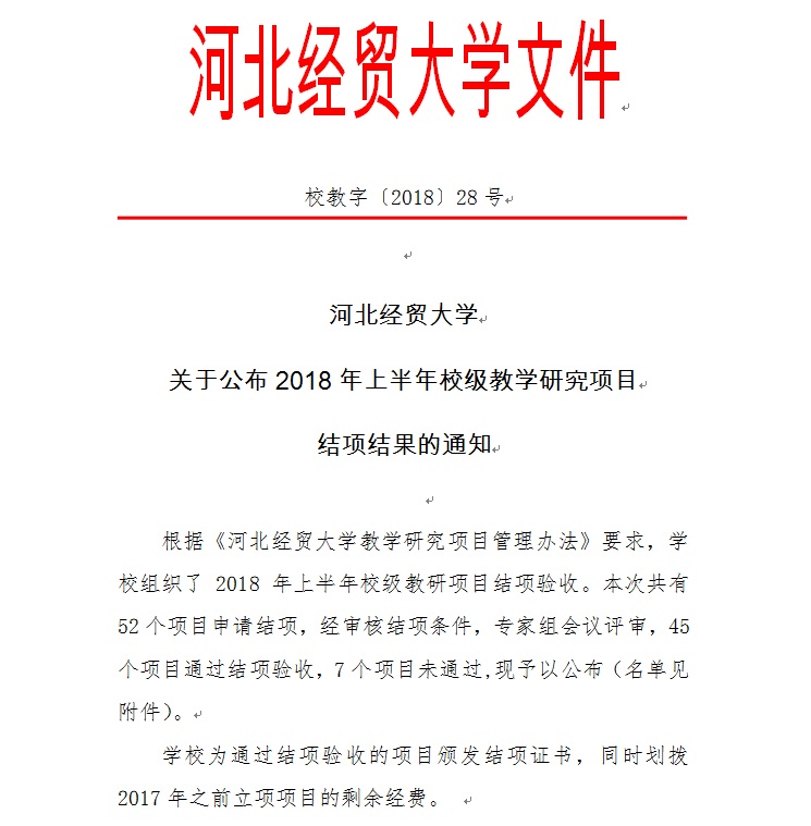 河北经贸大学关于公布2018年上半年校级教学研究项目结项结果的通知红头文件